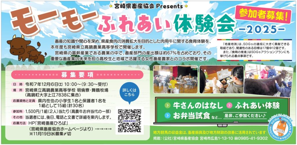 ・令和7年12月6日(土)10時から、宮崎県立高鍋農業高等学校 明倫寮・舞鶴牧場で実施します。